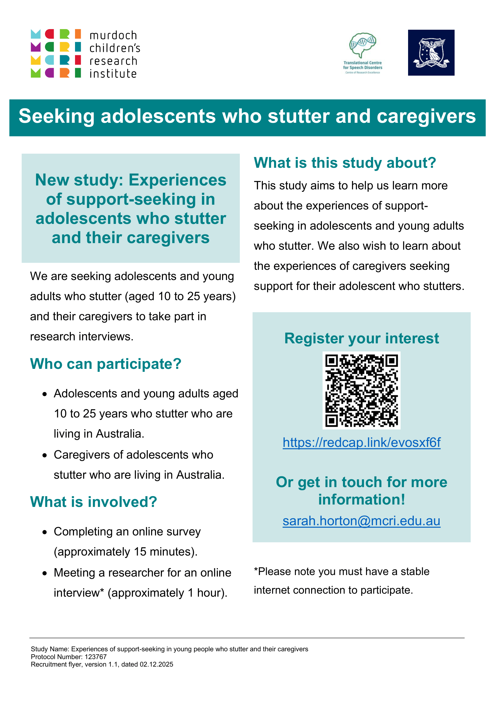 Please register your interest by emailing us at geneticsofspeech@mcri.edu.au Please see more information on the flyer here