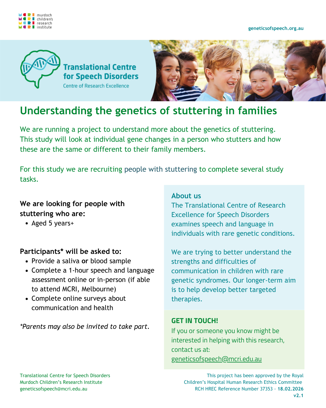 If you are interested in participating or if you have questions please email us at geneticsofspeech@mcri.edu.au